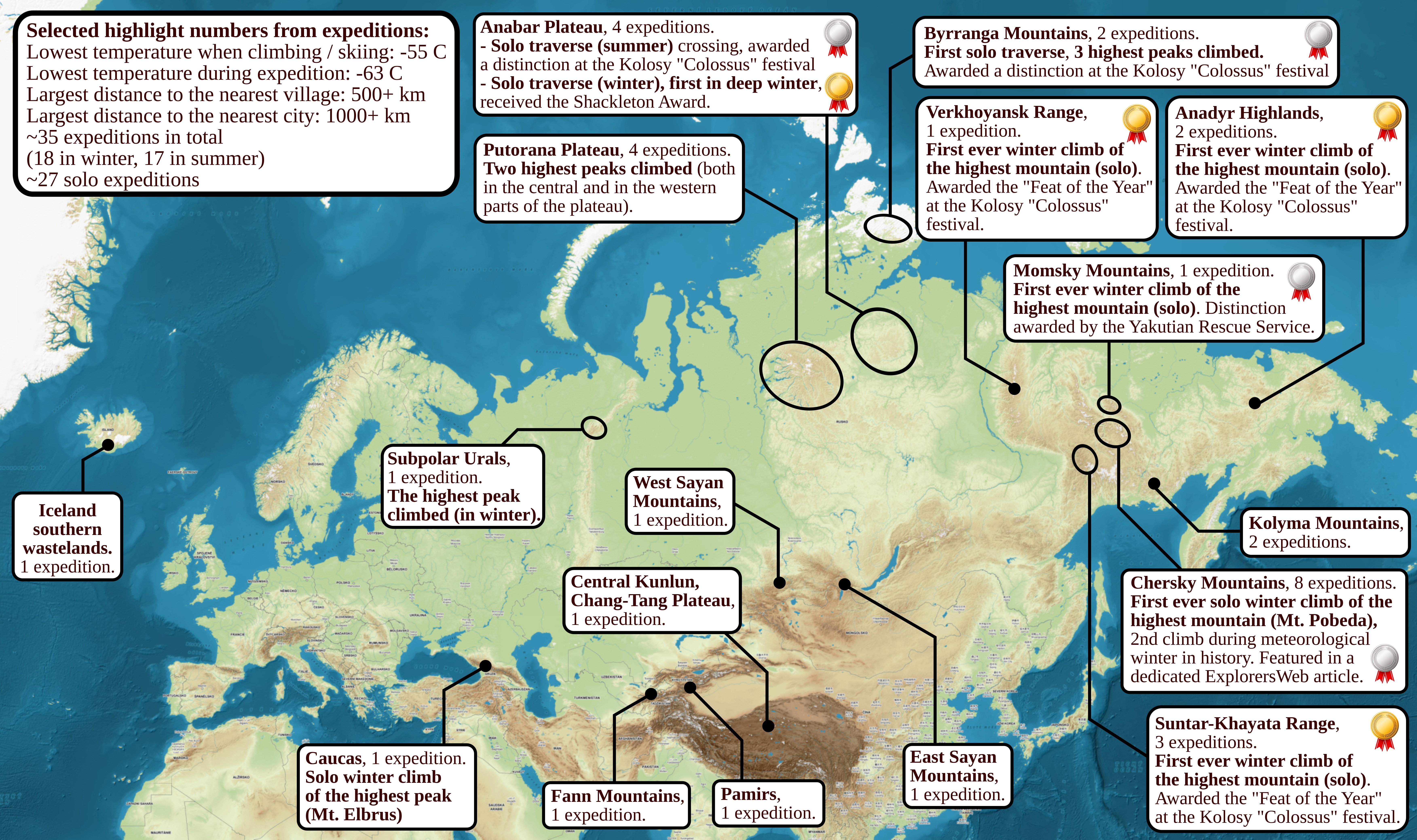 - The first winter ascent (solo, late January) of the highest peak (unnamed) in Momsky Mountains (a remote mountain range in Yakutia), with temperatures down to -55 Celsius;